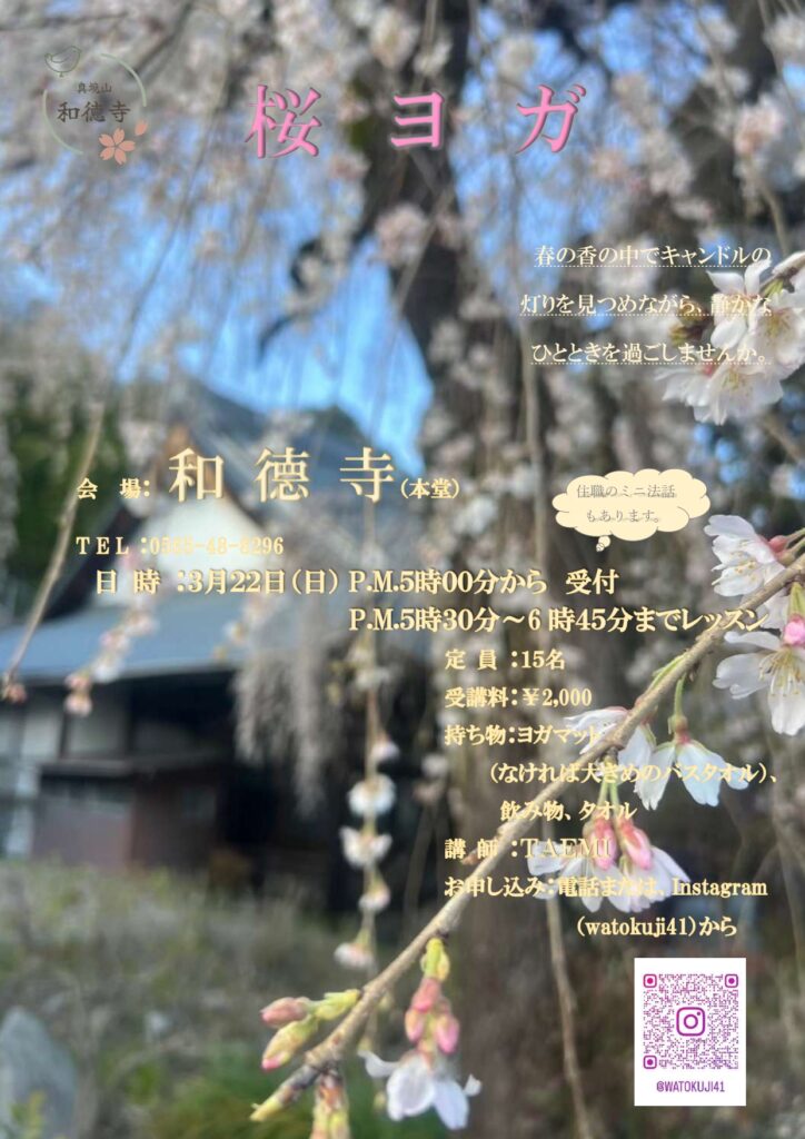 桜ヨガのご案内 2026年2月11日 最終更新日時 : 2026年2月11日 watoku 桜ヨガを開催します。 2026年 3月22日(日) 17時 受付開始 17時30分 レッスンスタート 18時45分 レッスン終了予定 お問い合わせ、ご予約はInstagram(watokuji41)からお願いいたします。