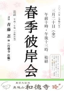 春季彼岸会を厳修いたします。 日時: 3月20日(金)午前10時•午後13時(始経) 法話: (各法要後) 青藤忍 師 法要前に庫裡受付にてお燈明料(志納金)を納めていただき、本堂にてご参詣ください。 また午前の法話後に […]